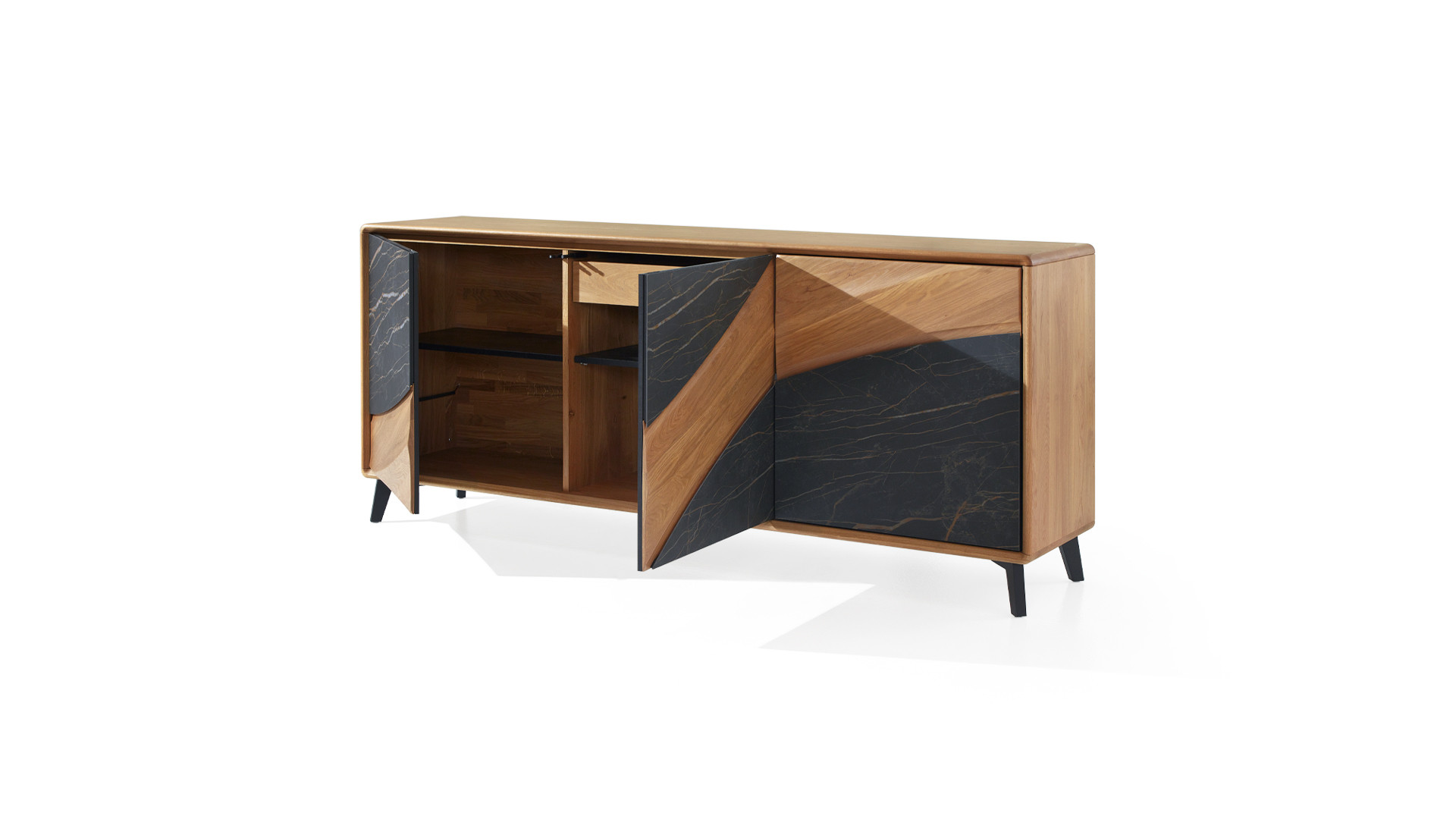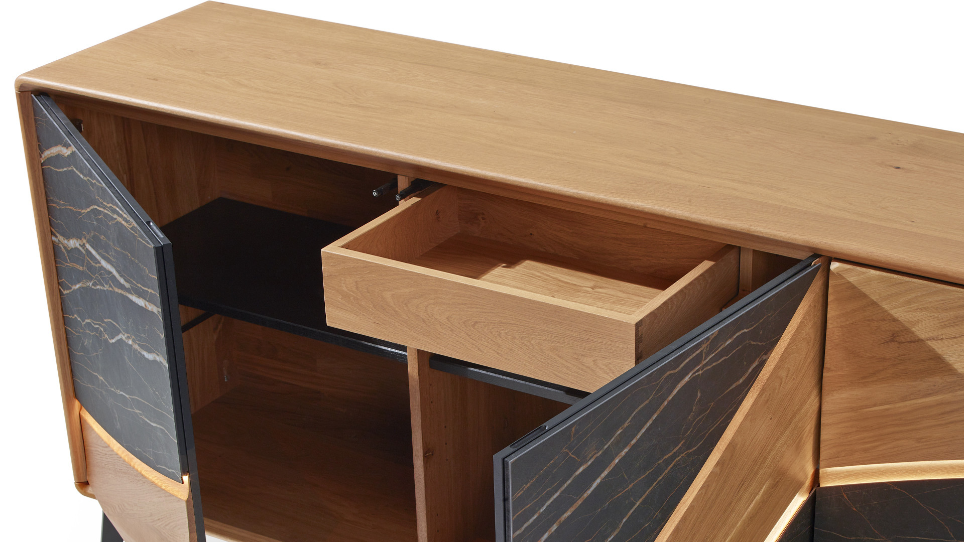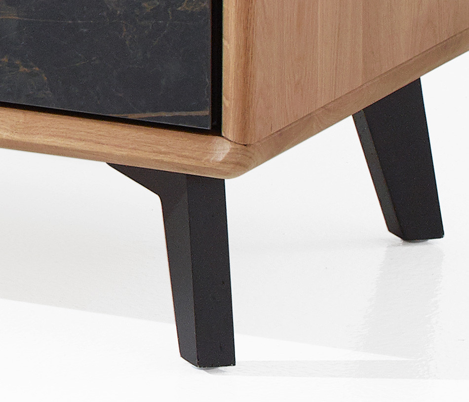 Portes en panneaux décor chêne massif ép. 21 mm, vissés depuis l'arrière des panneaux support en panneau de fibres de haute densité 1050kg/m3, ép. 13 mm, finition laqué noir mat, décors en céramique marbrée ép. 3 mm, collés sur une entretoise en médium ép. 8 mm, ferrage par charnières invisibles avec amortisseur intégré. Ouverture par "push and pull"