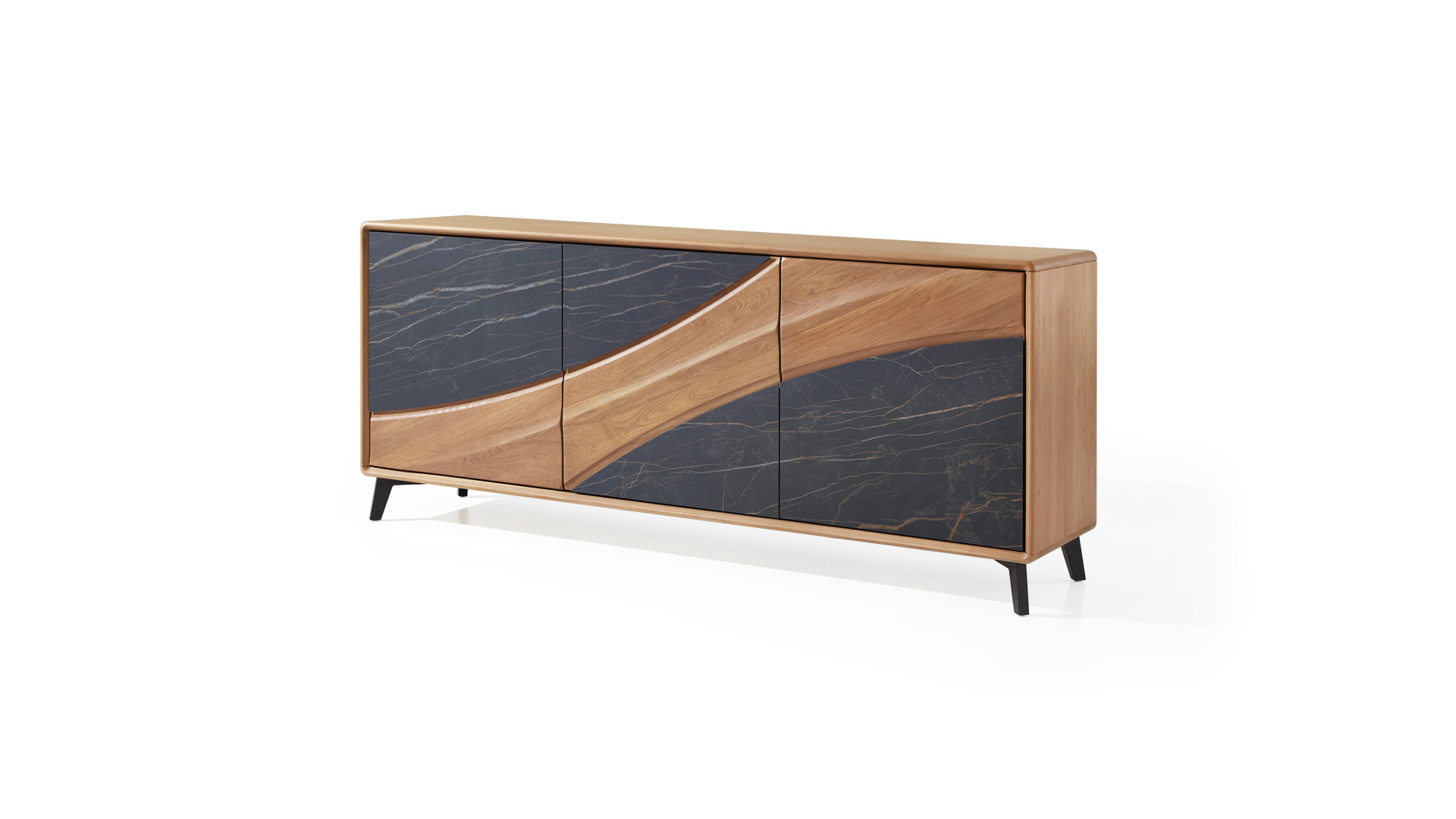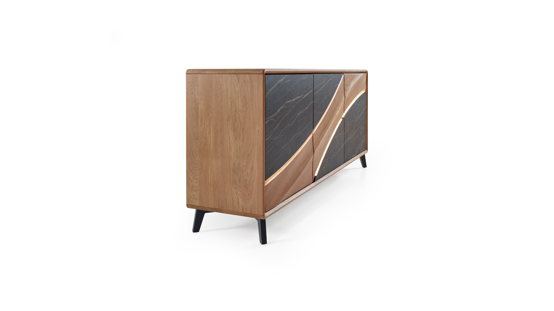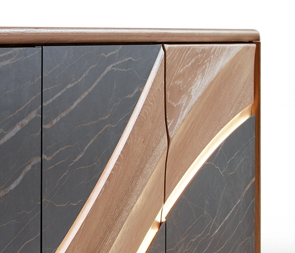 Portes en panneaux décor chêne massif ép. 21 mm, vissés depuis l'arrière des panneaux support en panneau de fibres de haute densité 1050kg/m3, ép. 13 mm, finition laqué noir mat, décors en céramique marbrée ép. 3 mm, collés sur une entretoise en médium ép. 8 mm, ferrage par charnières invisibles avec amortisseur intégré. Ouverture par "push and pull"