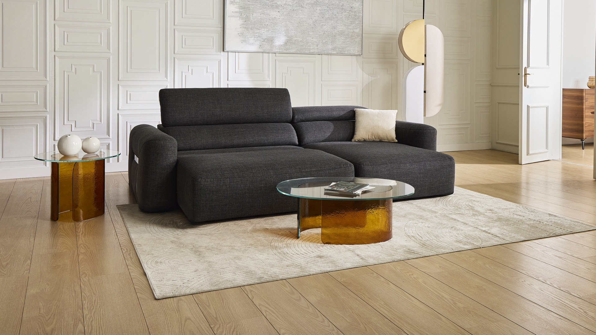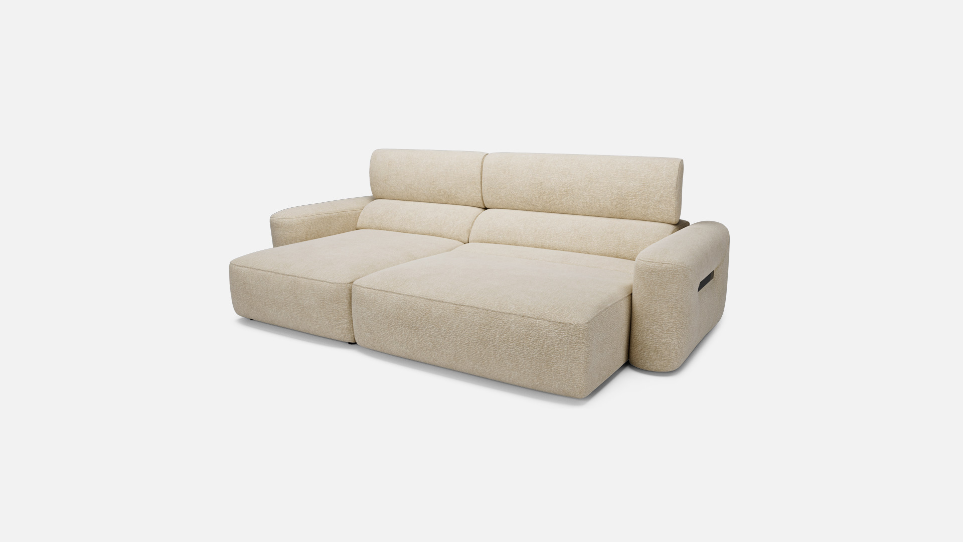 Révélation est un canapé où toute la famille peut s’allonger devant ses séries préférées et qui se replie sans effort pour libérer l’espace. Sa grande assise motorisée s’étend de 50 cm jusqu’à la chaise longue, formant un vrai lit d’appoint à offrir à vos invités.