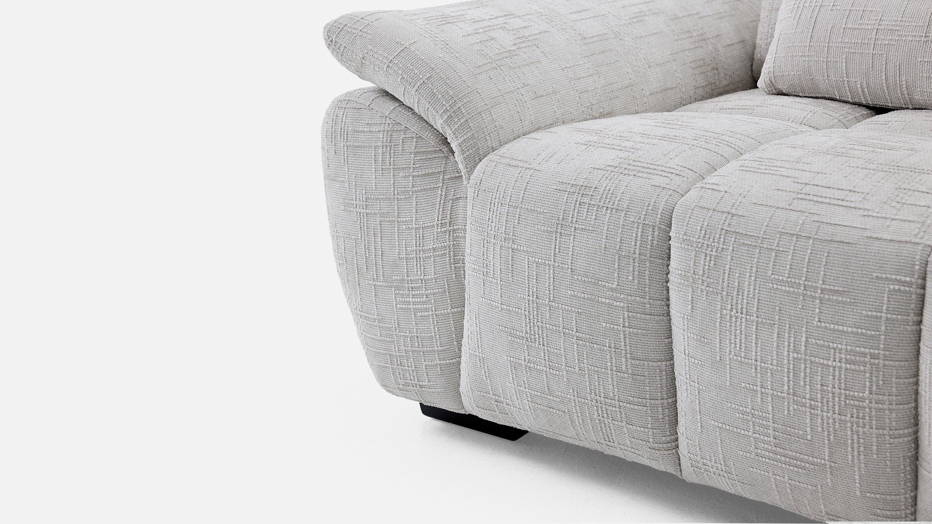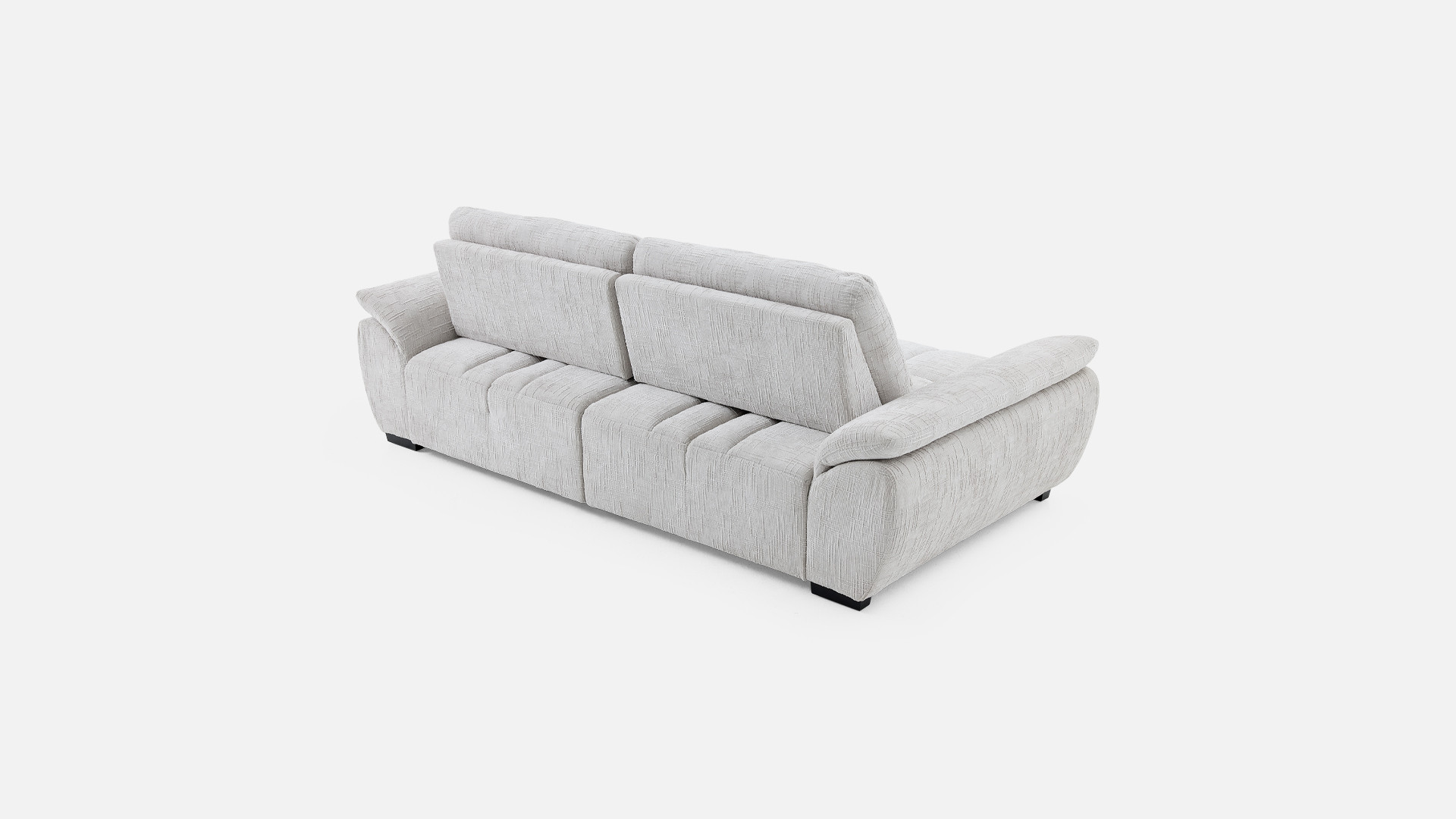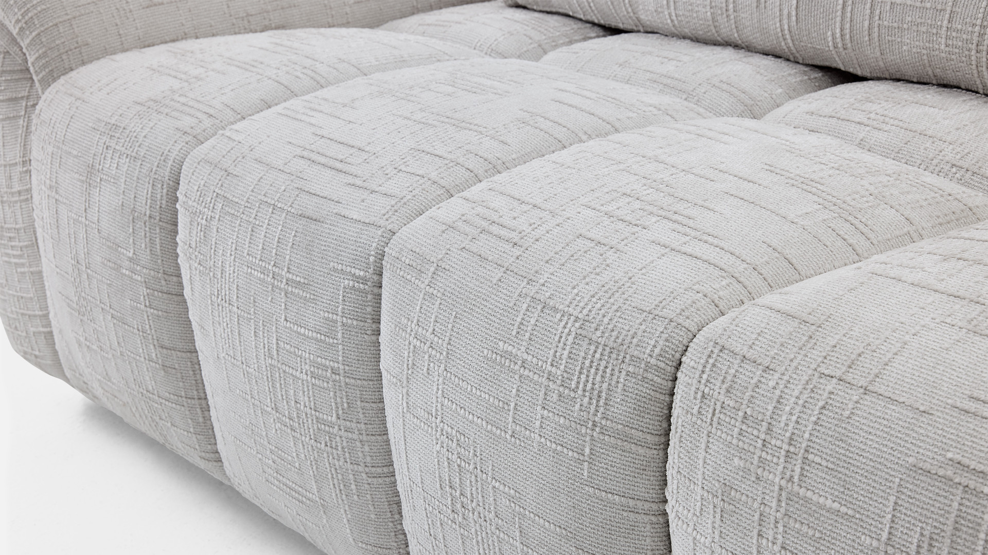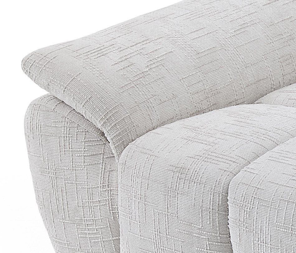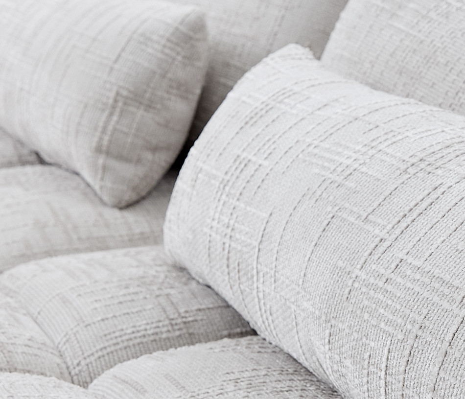 Le tissu chenillé beige perle ou gris clair, qui habille ce canapé révèle un relief subtil offrant une grande douceur au toucher.