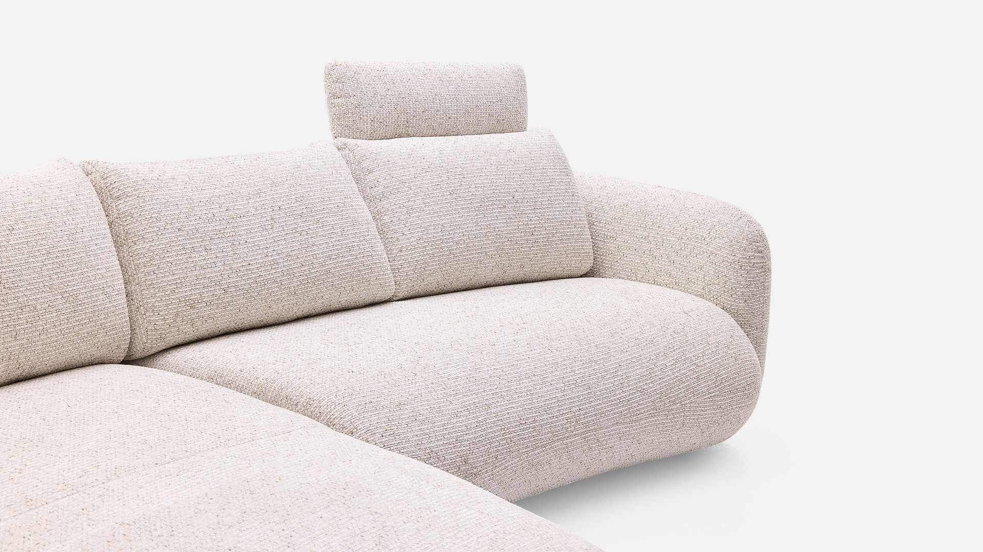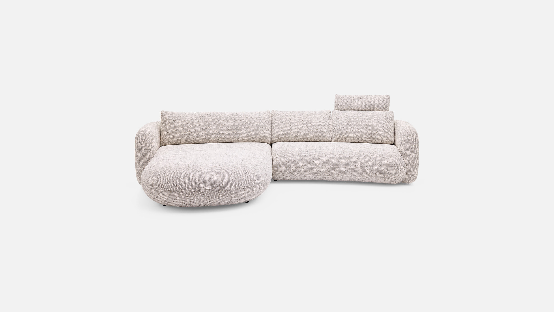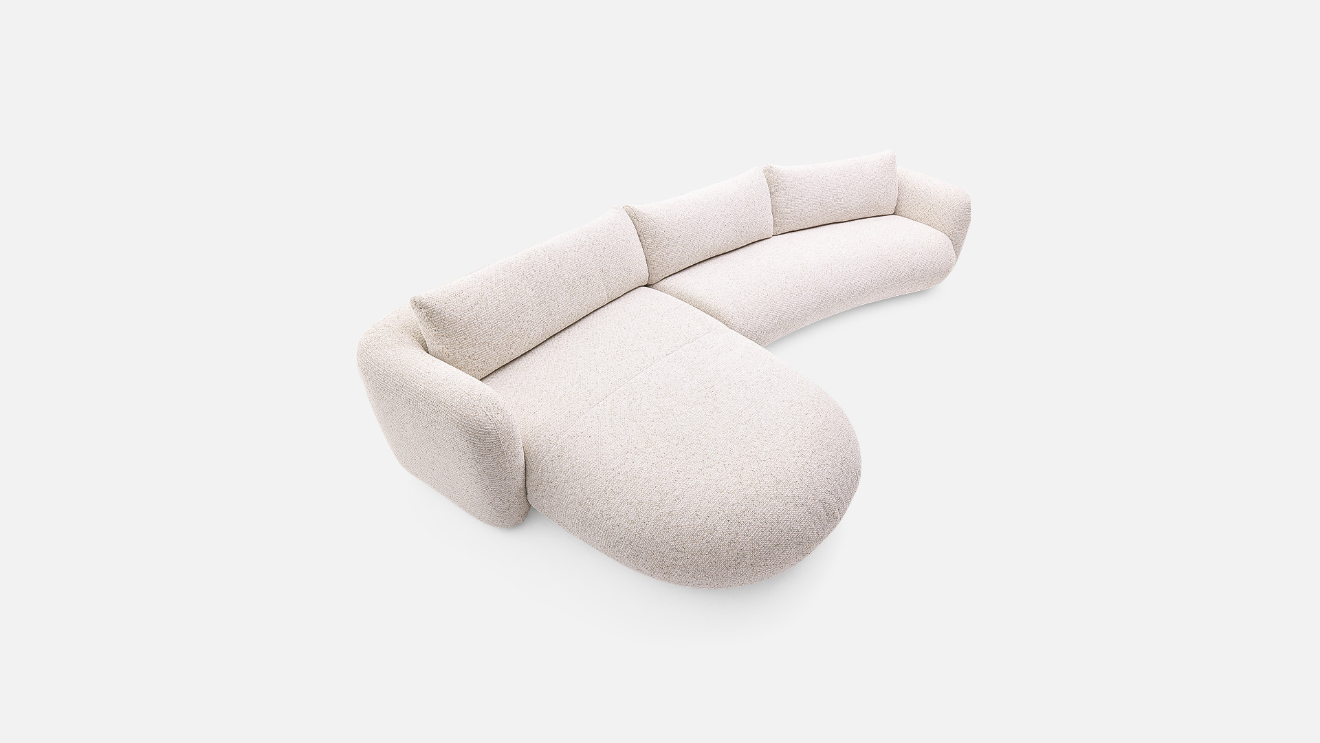 Prix de lancement : canapé d’angle de forme organique composé d’un élément avec accoudoir L. 188 cm + chaise longue L. 168 cm, en tissu en tissu cat. G3.087 coloris Ivory. 100% polyester. hydrofuge.