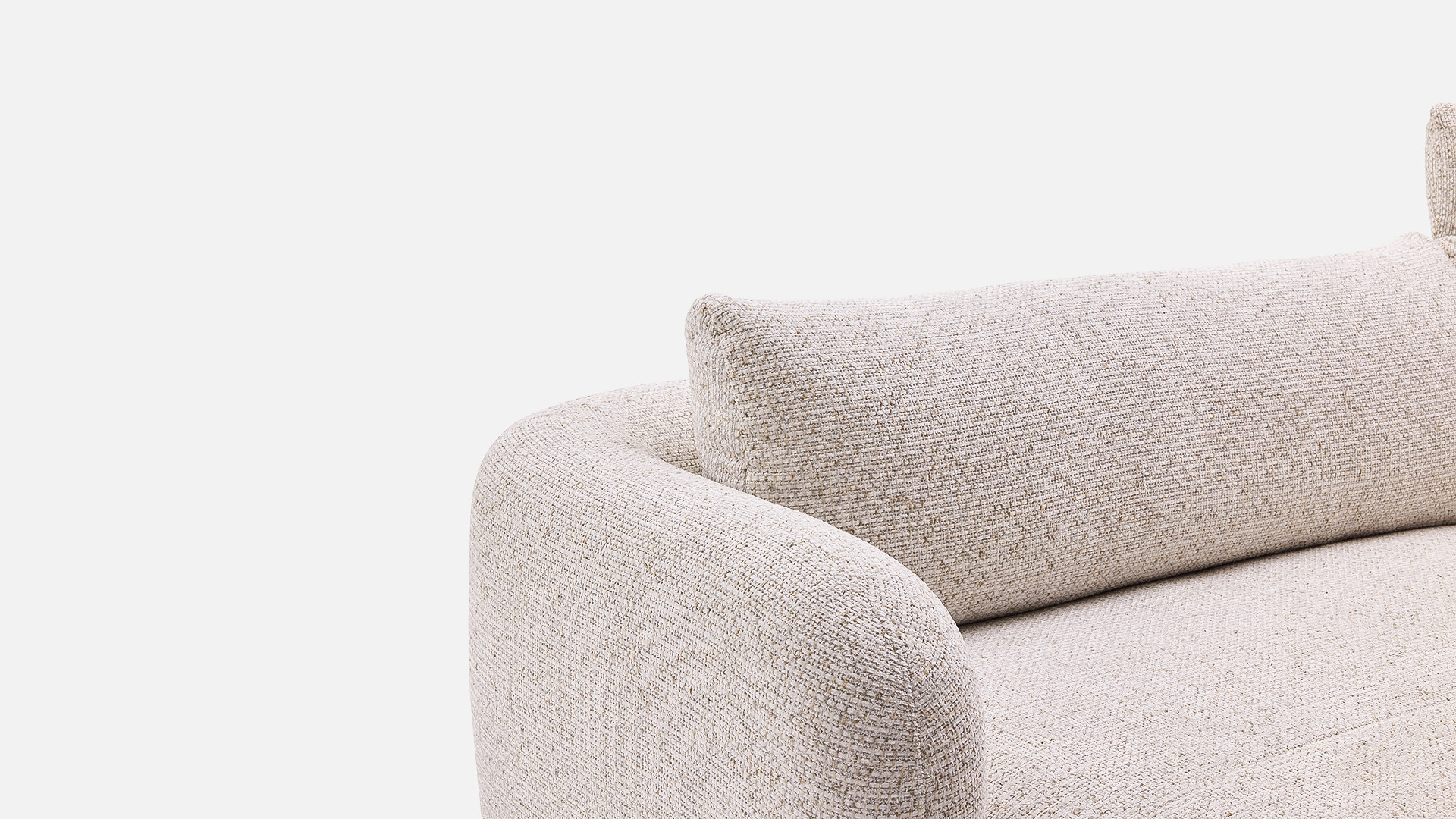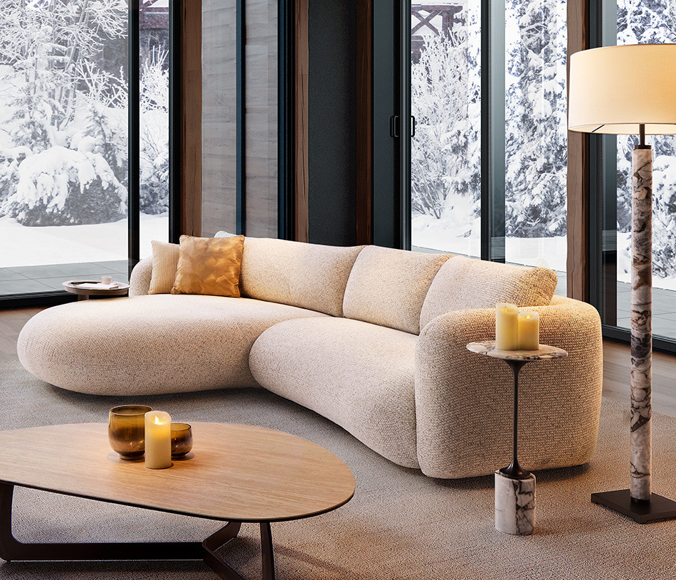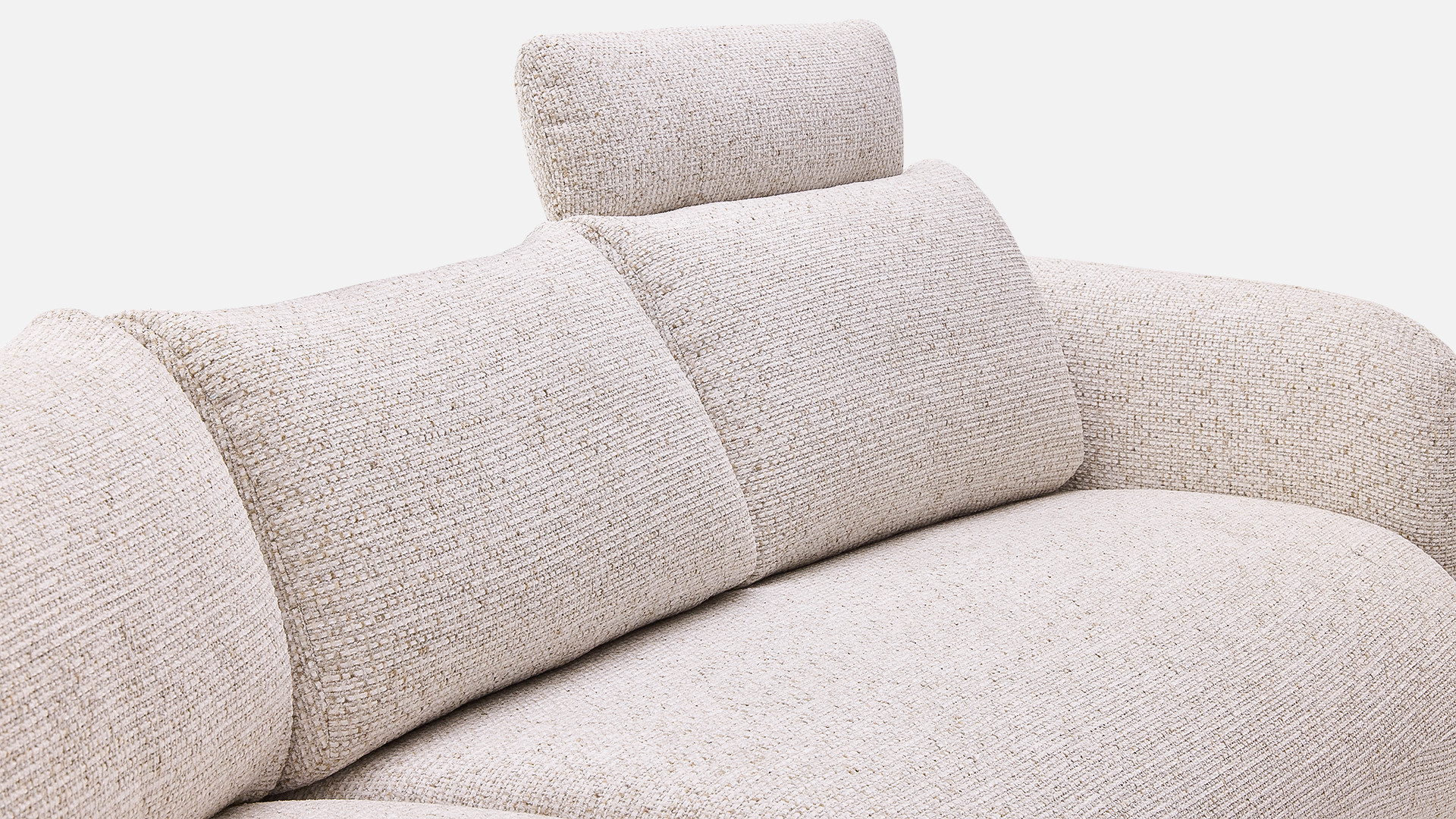 Prix de lancement : canapé d’angle de forme organique composé d’un élément avec accoudoir L. 188 cm + chaise longue L. 168 cm, en tissu en tissu cat. G3.087 coloris Ivory. 100% polyester. hydrofuge.