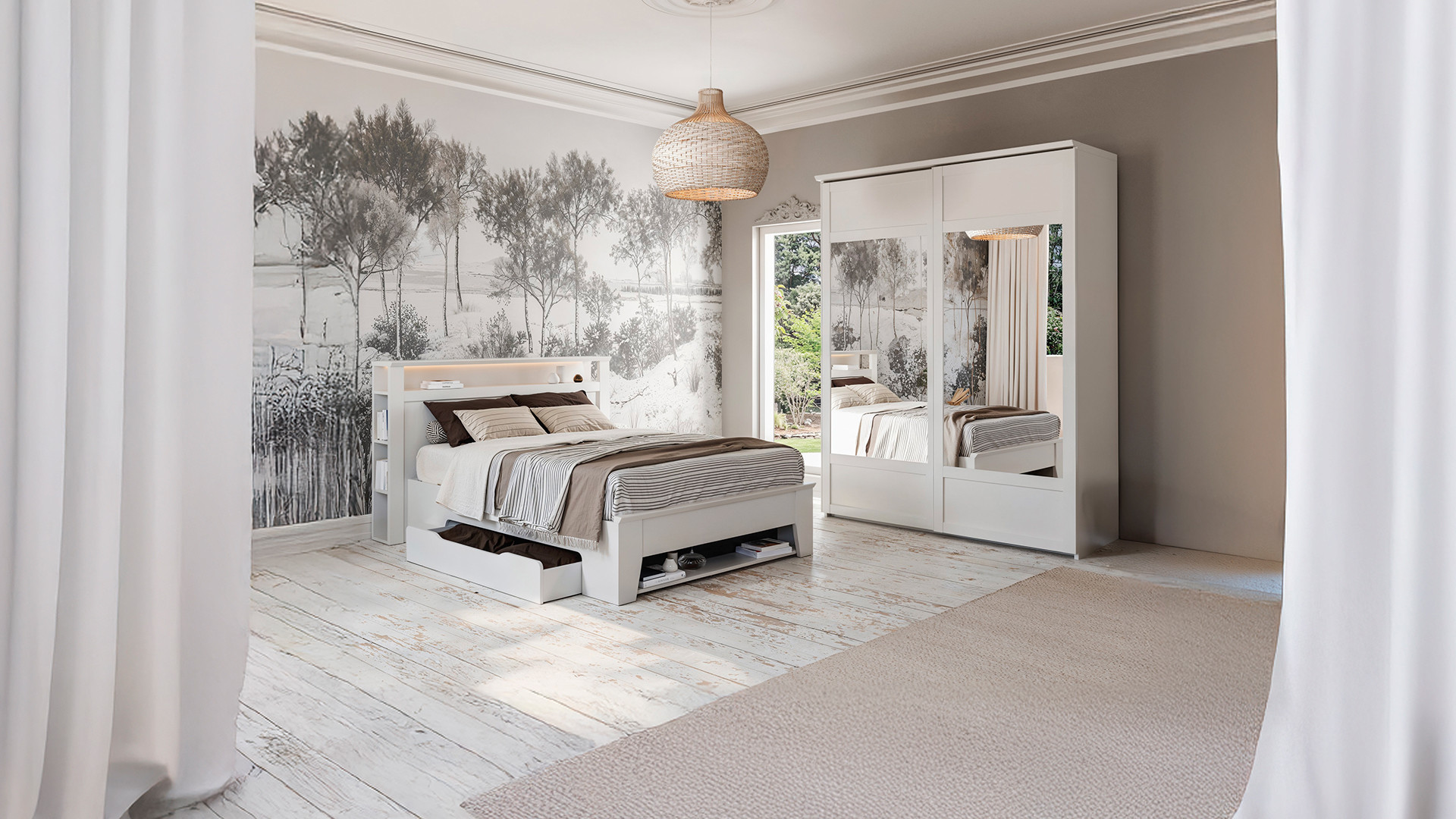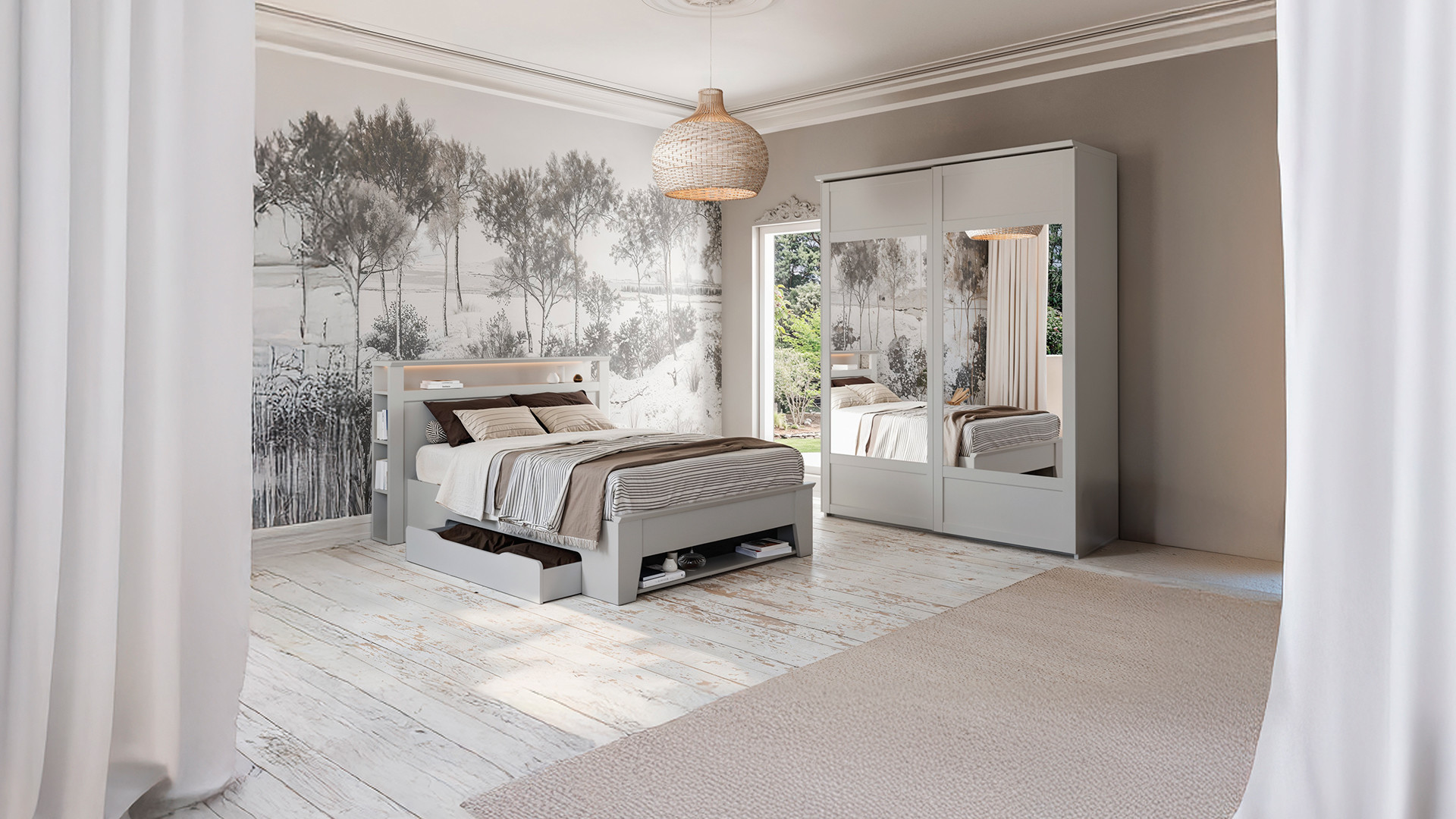 Optimisez votre espace de la plus belle manière avec cet ensemble fonctionnel proposé en blanc lin ou gris galet. Dotée d’un éclairage LED intégré, la tête de lit offre de multiples niches dessus et sur les côtés.