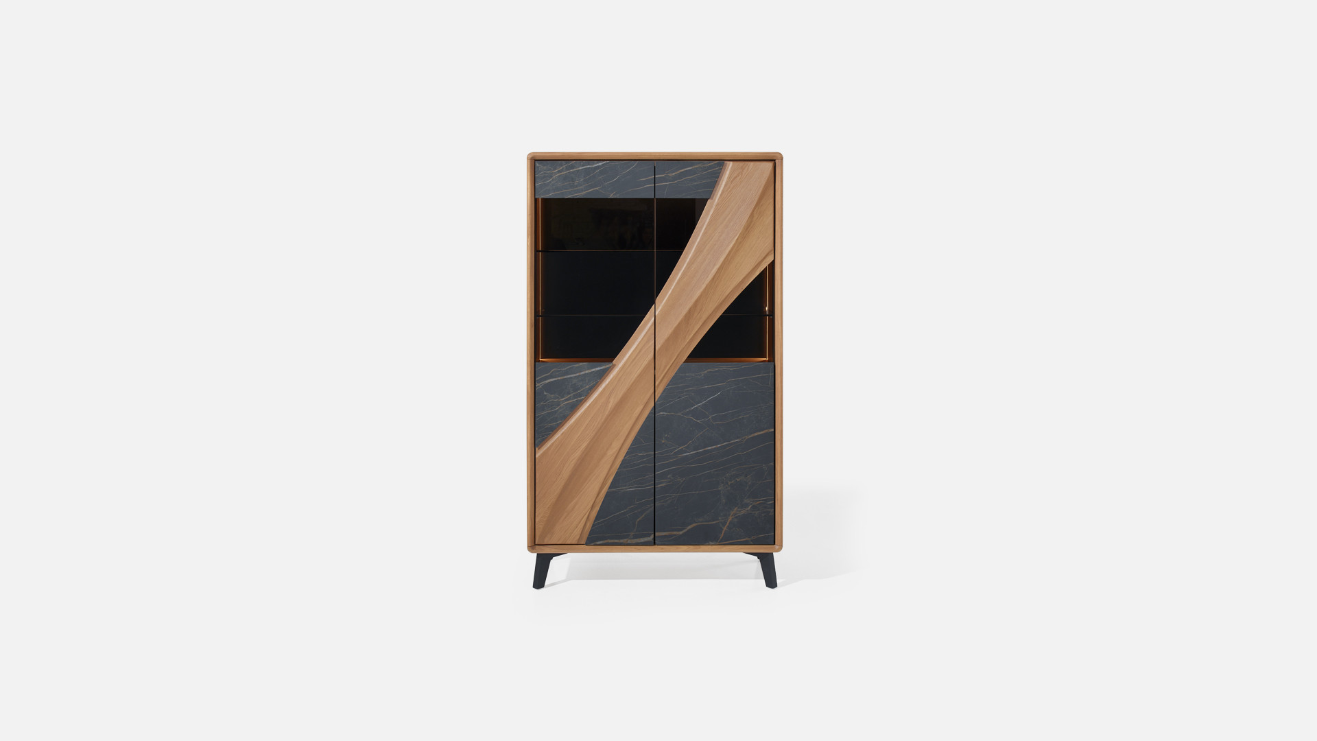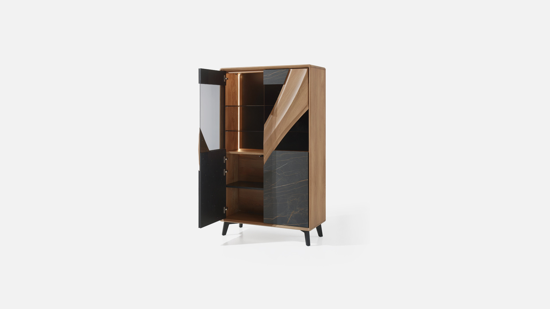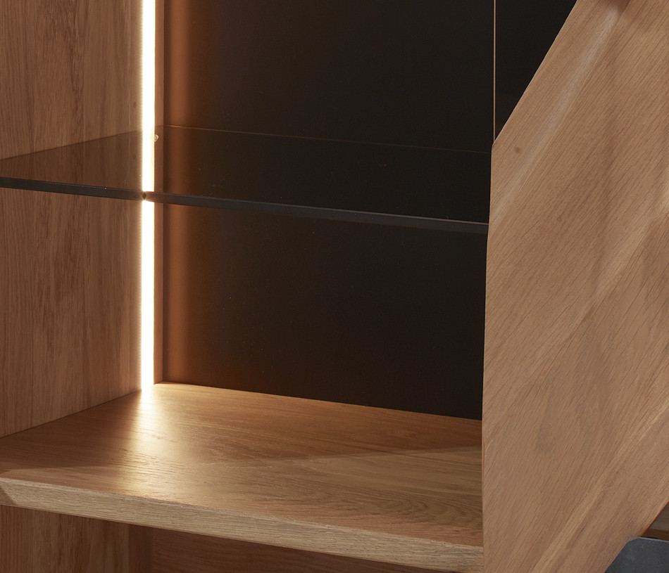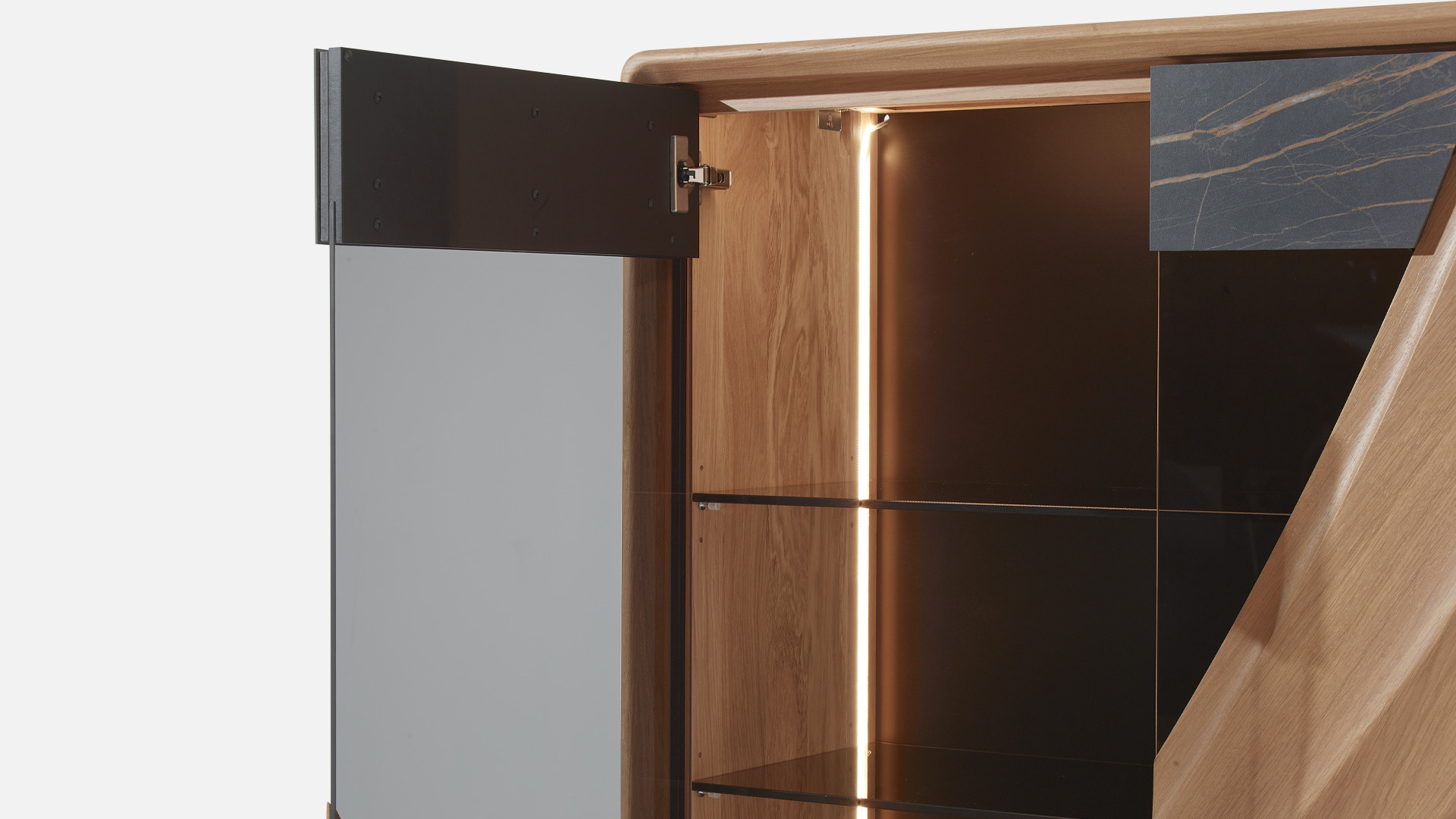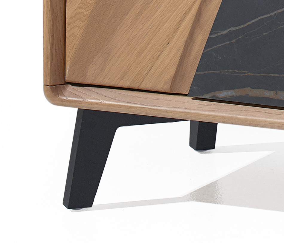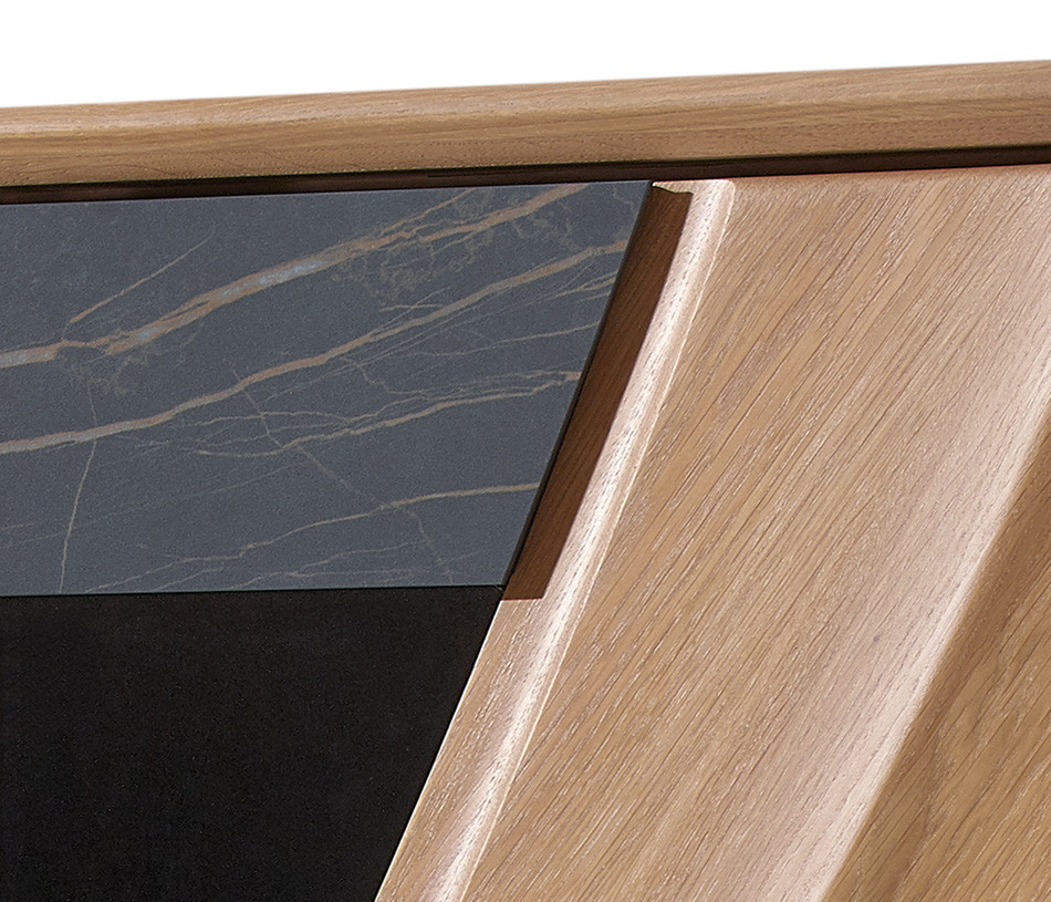 Portes en panneaux décor chêne massif ép. 21 mm, vissés depuis l'arrière des panneaux support en panneau de fibres de haute densité 1050kg/m3, ép. 13 mm, finition laqué noir, verre trempé grisé ép. 6 mm et décors en céramique marbrée ép. 3 mm, collés sur une entretoise en médium ép. 8 mm, ferrage par charnières invisibles avec amortisseur intégré. Ouverture par "push and pull".