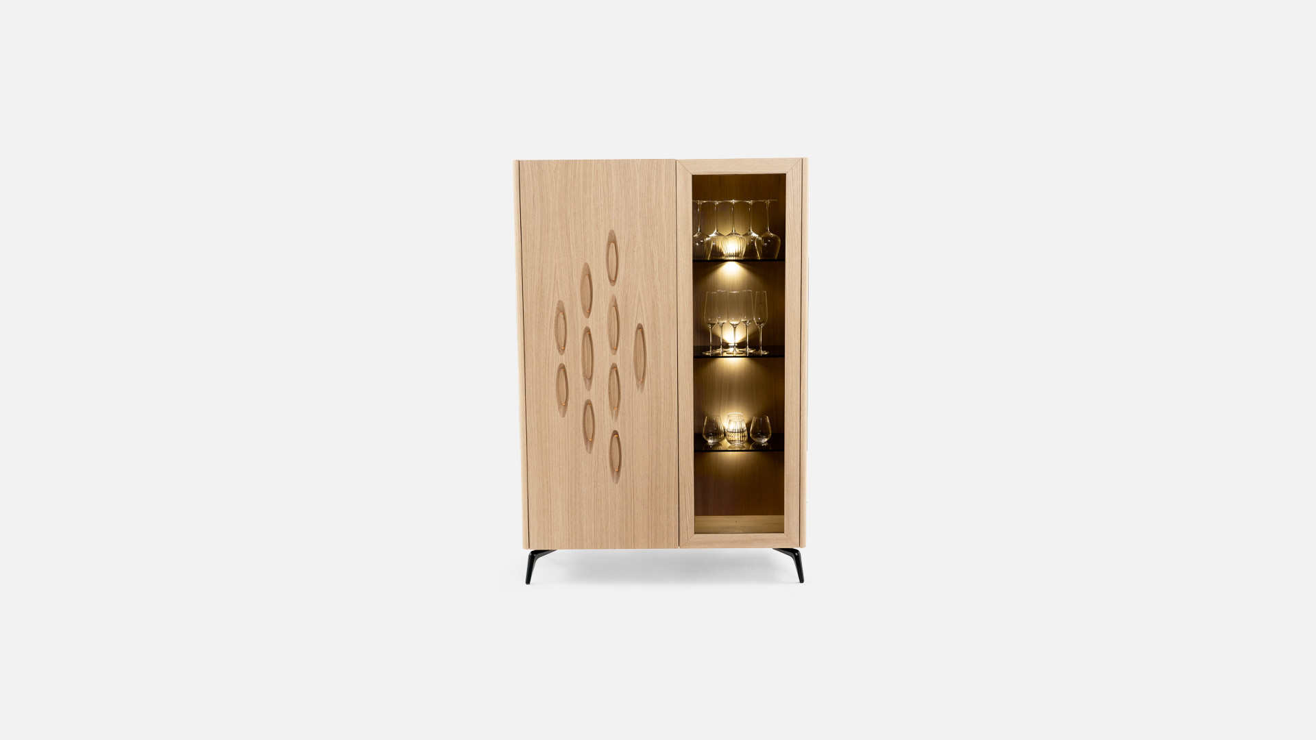 Porte en placage chêne sur panneaux de fibres de moyenne densité, ép. 30 mm et porte vitrée en verre fumé ép. 6 mm
