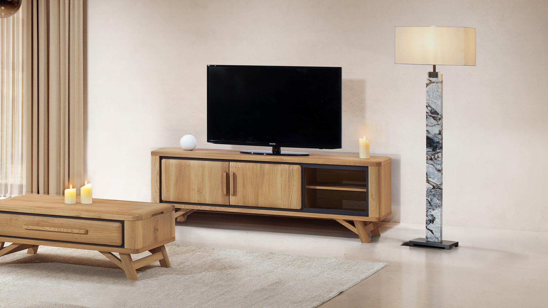 Composé d’une niche et d’une partie fermée, le meuble TV ONTARIO rassemble avec élégance vos équipements multimédias. Ses deux portes massives révèleront leur authenticité avec un fond et des poignées contrastées.