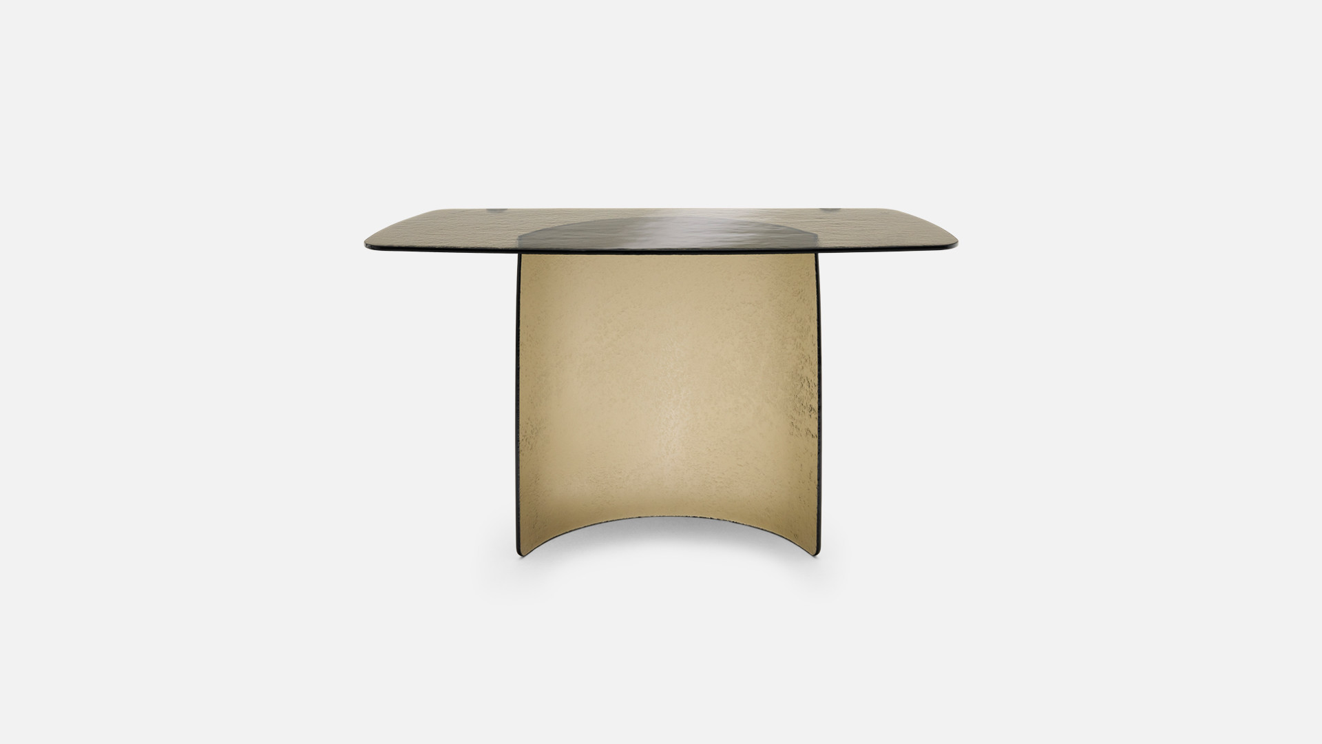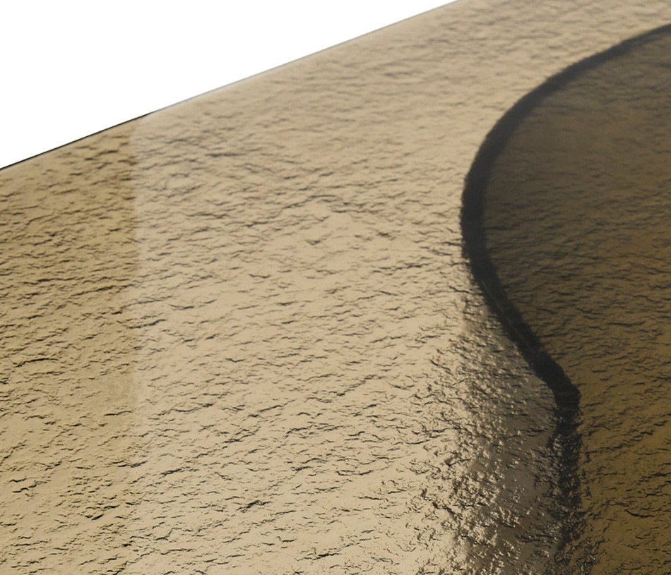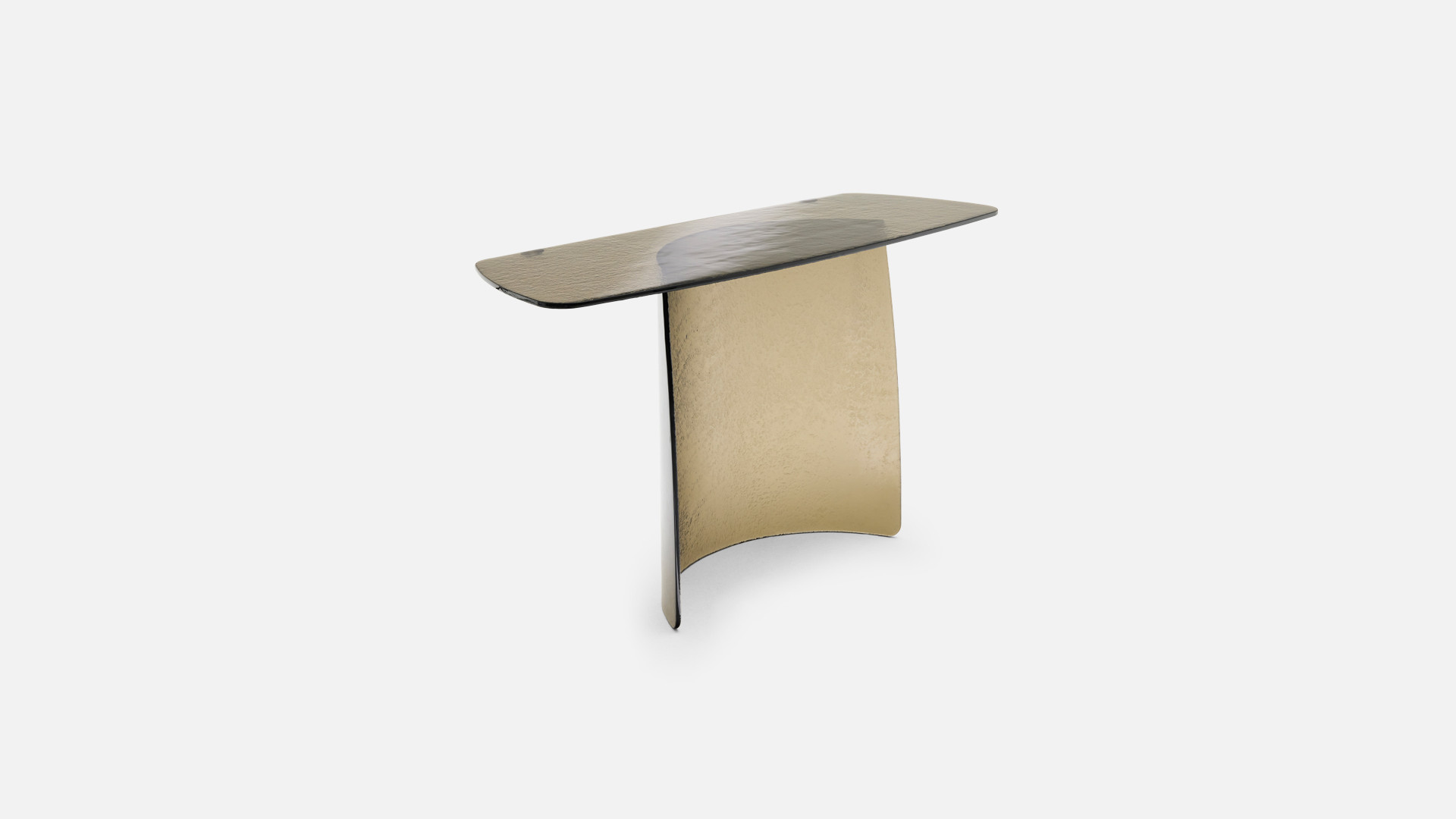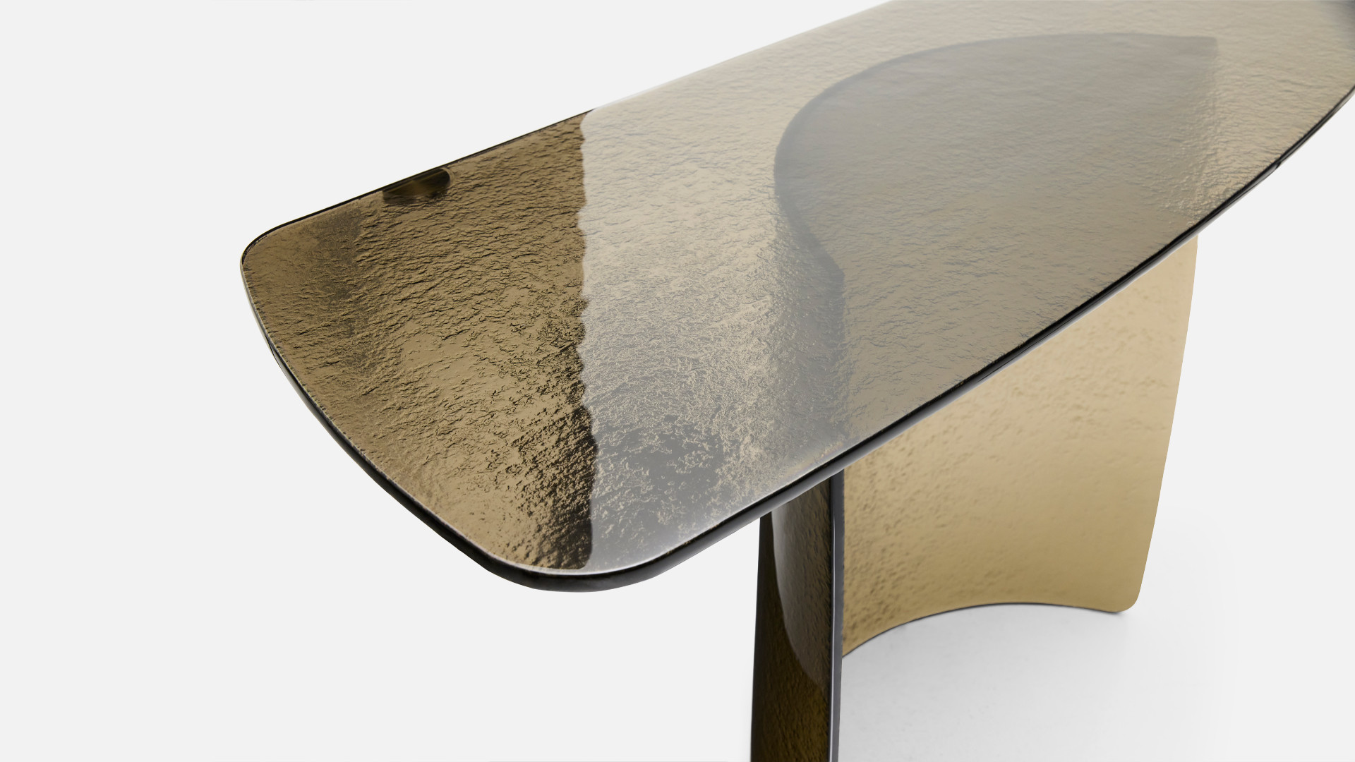 La lumière dessine les lignes épurées de la console GAIA et révèle la beauté translucide de sa surface texturée. Entièrement réalisée en verre fusion trempé coloris bronze, cette création sculpturale associe un plateau asymétrique à un pied courbé dans un équilibre d’une grande légèreté. Deux plaques métalliques permettent de la fixer au mur pour une parfaite stabilité.