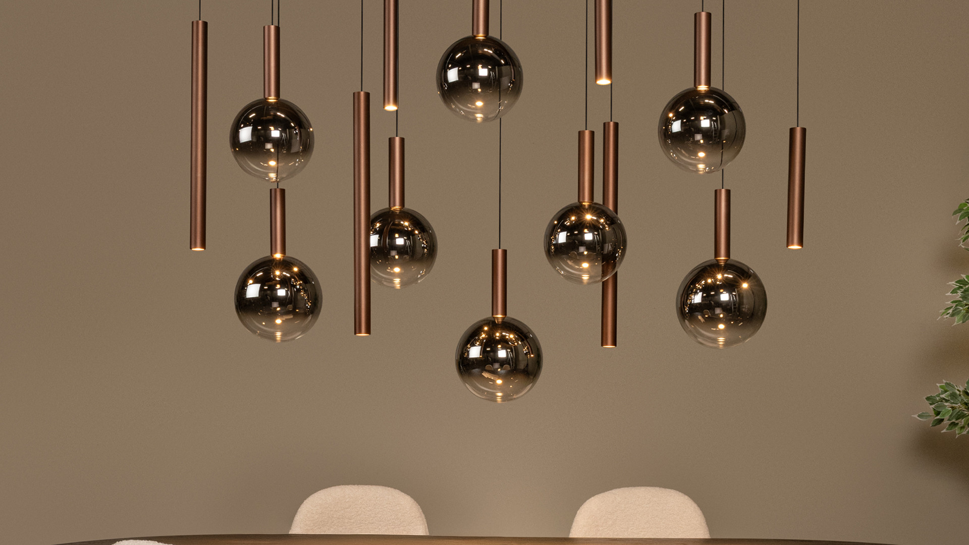 La suspension JASMINE associe verre fumé et accents en cuivre pour créer une pièce maîtresse lumineuse et résolument contemporaine. Alliant matériaux haut de gamme et technologie LED, elle diffuse une lumière douce et enveloppante, sublimant l’intérieur tout en affirmant son caractère design.
