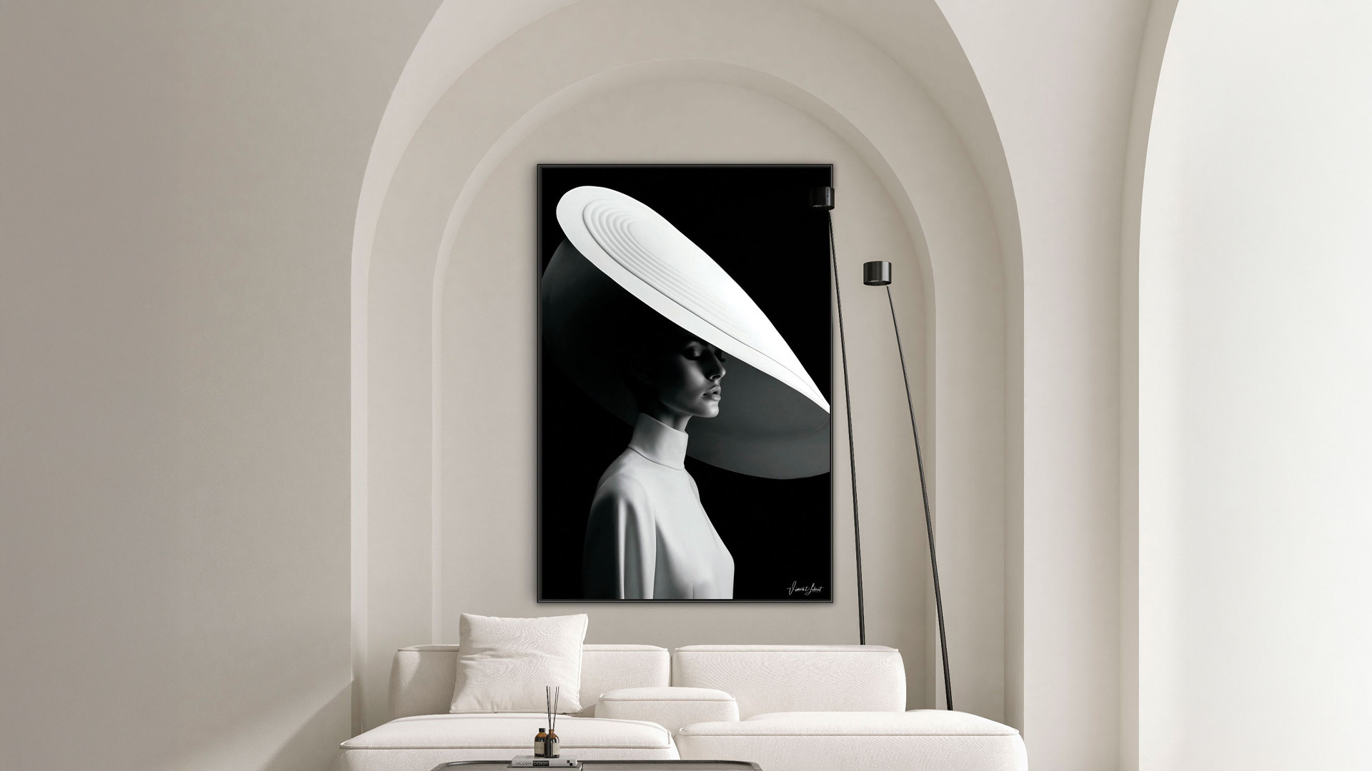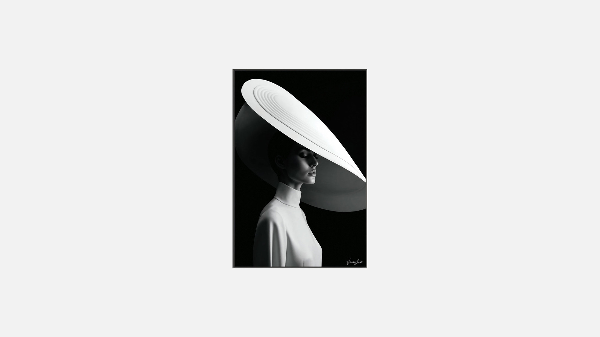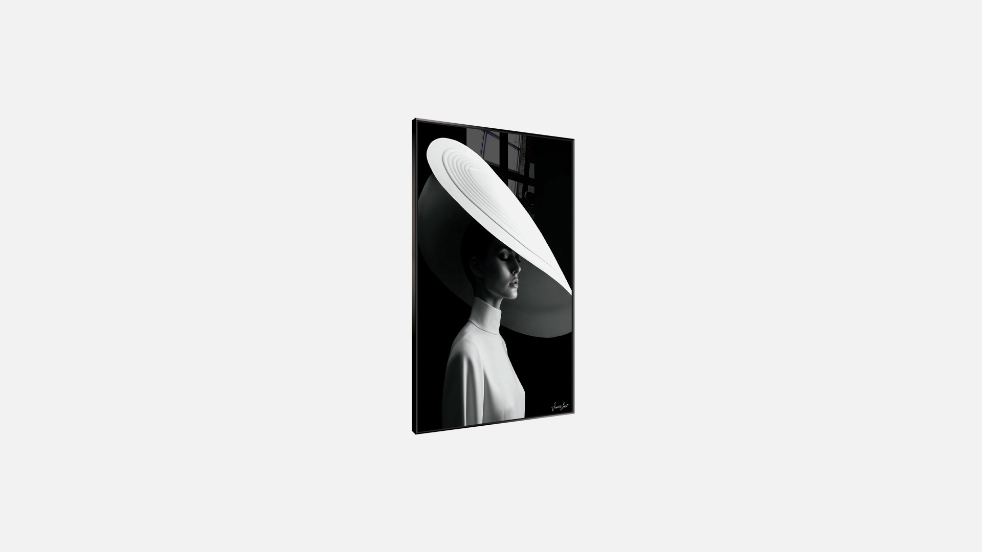 Signé par l’artiste Vincent Lebret, Foglia révèle une scène empreinte de mystère et de grâce. Une femme se tient dans l’ombre, sa silhouette délicate mise en valeur par une capeline blanche majestueuse, symbole de raffinement et de lumière au cœur de la pénombre. Imprimée en très haute définition sur une plaque de plexiglass et doublée d’un composite aluminium brossé, l’œuvre gagne en profondeur et en brillance, offrant une présence fascinante et poétique dans tout intérieur.