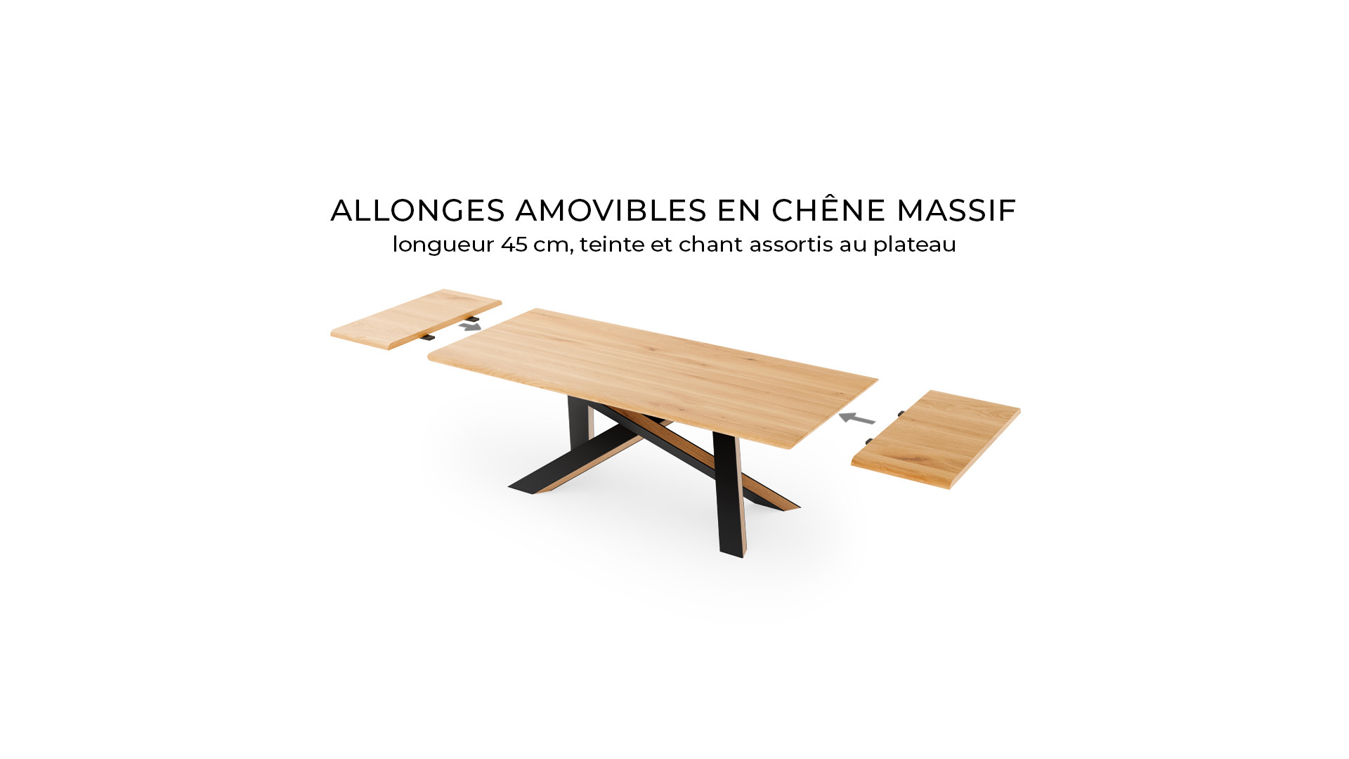 Allonge amovible L. 45 cm en bout de table, en chêne massif ép. 40 mm, assortie au plateau.
