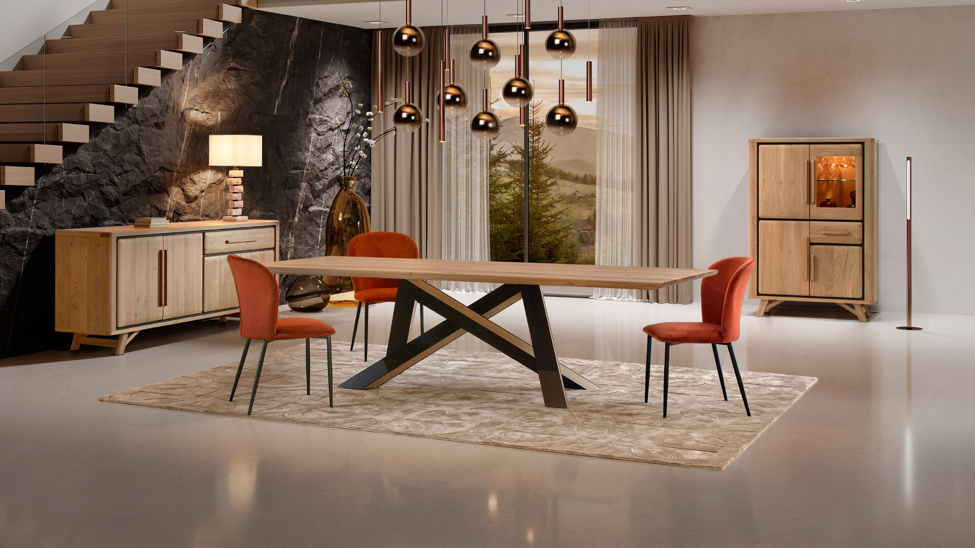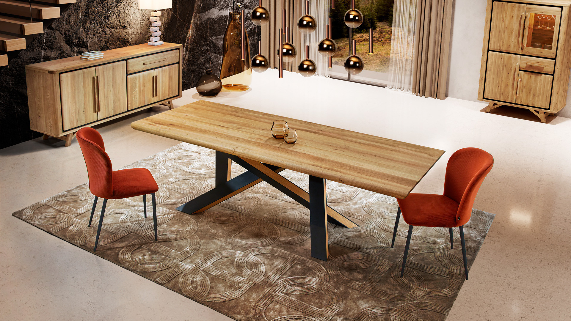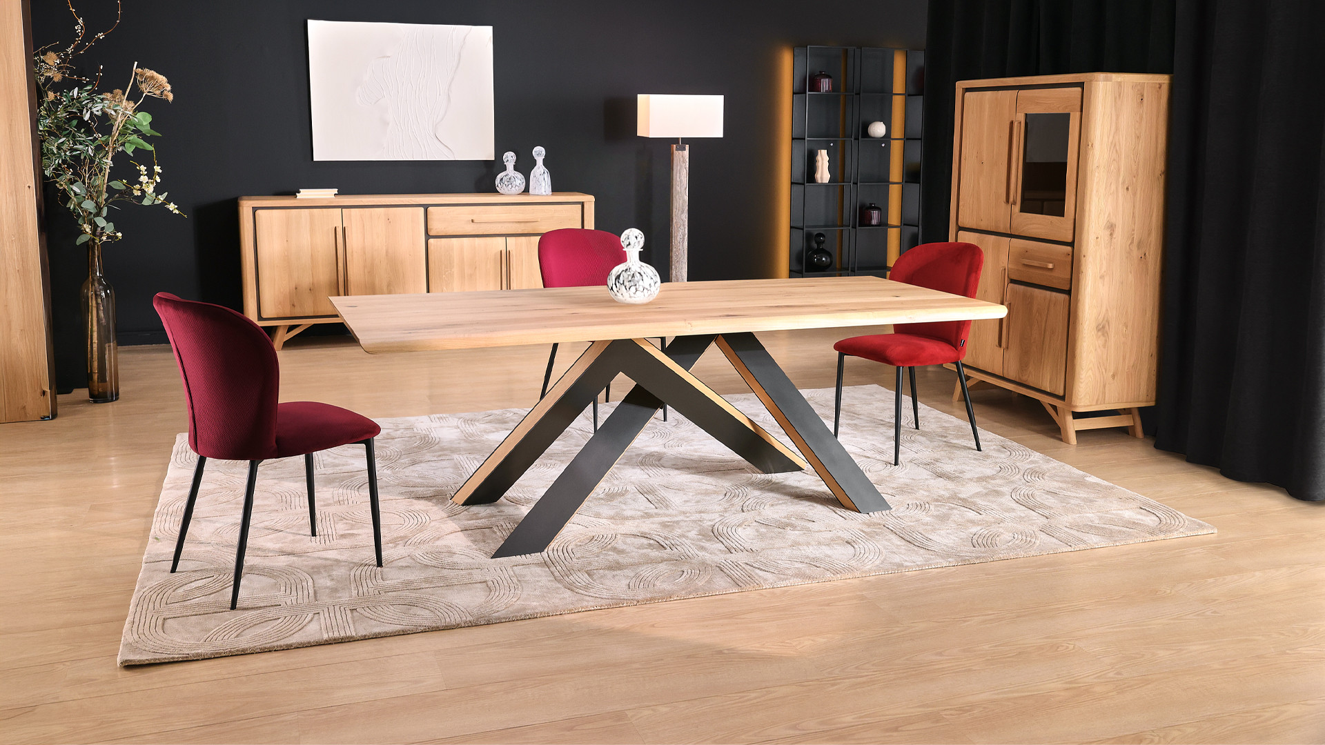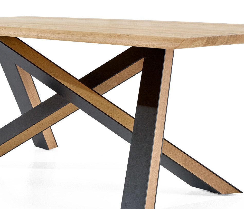 Plateau en chêne massif ép. 40 mm, avec renforts structurels (raidisseurs) en acier coloris noir forest.