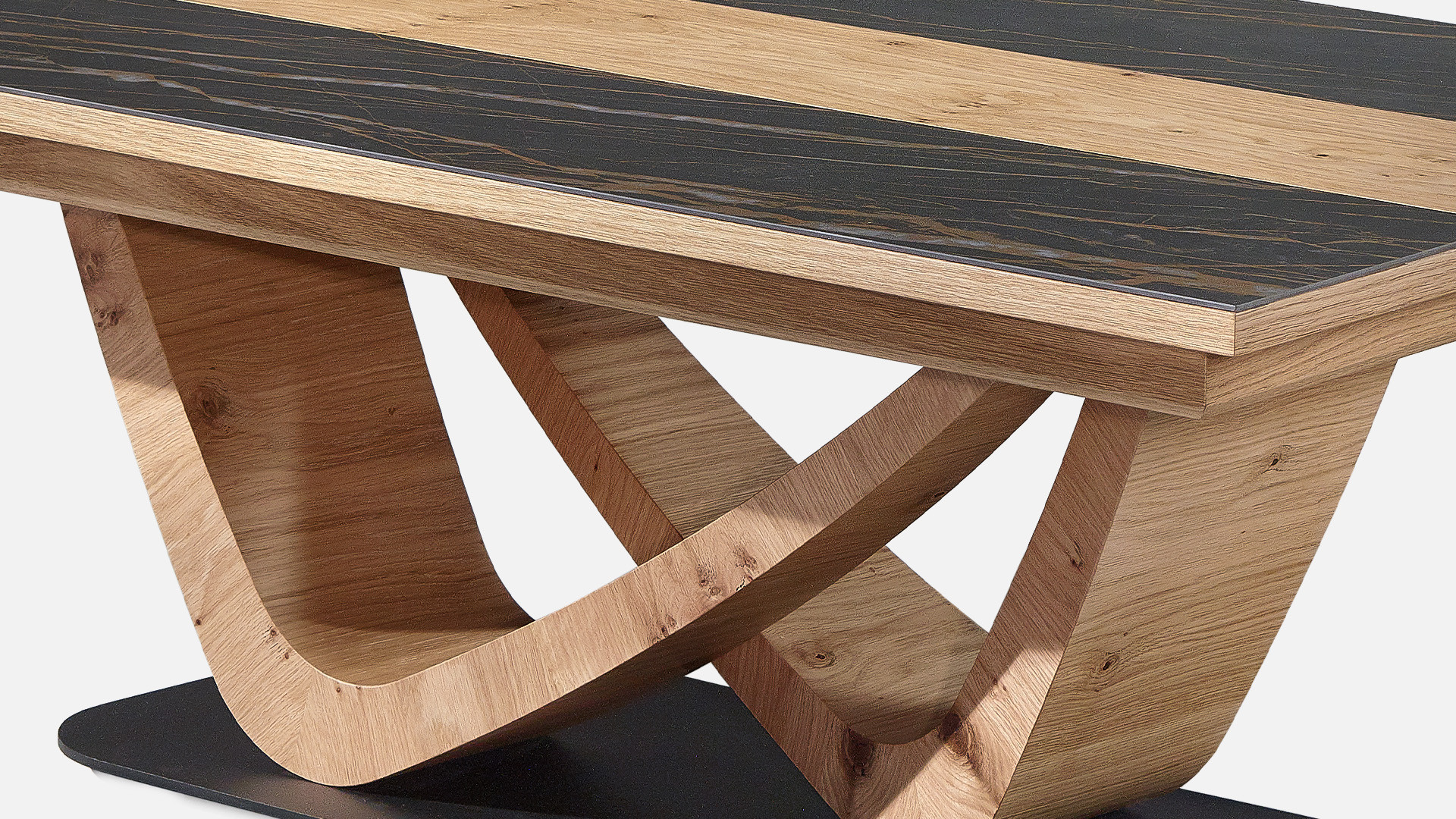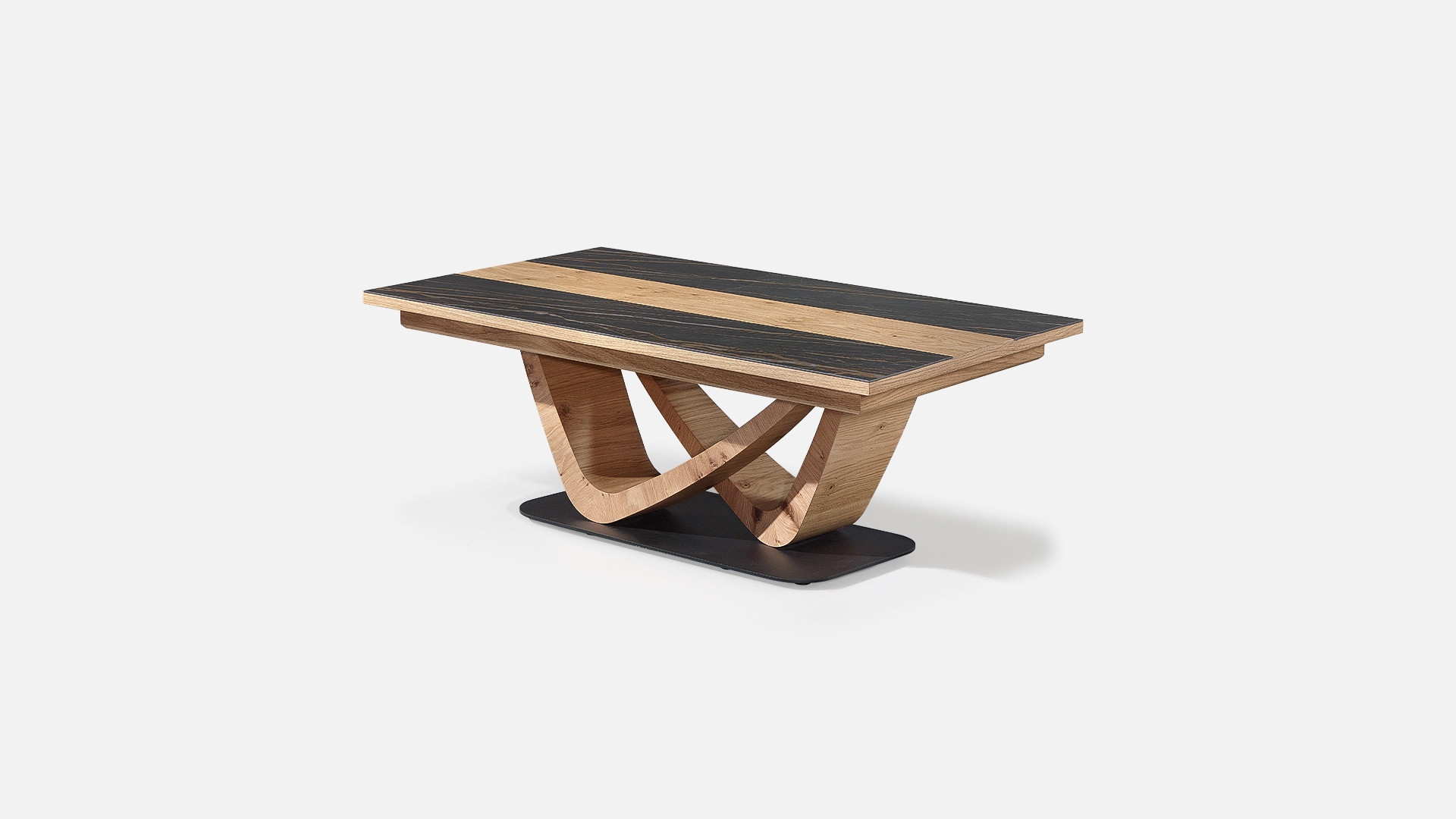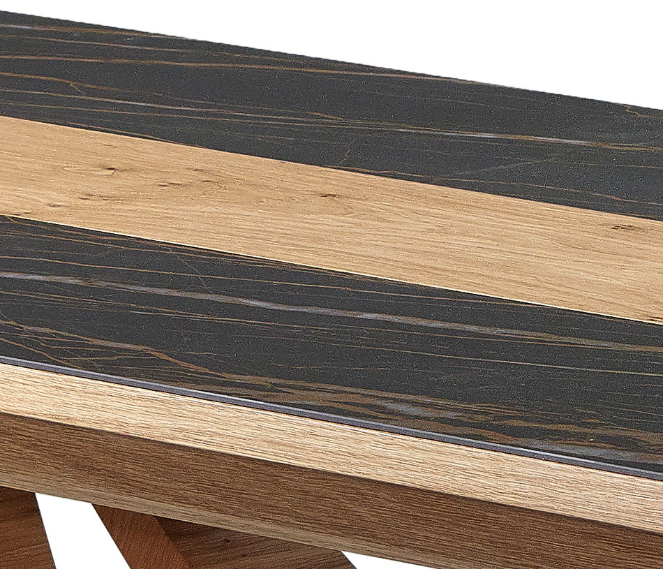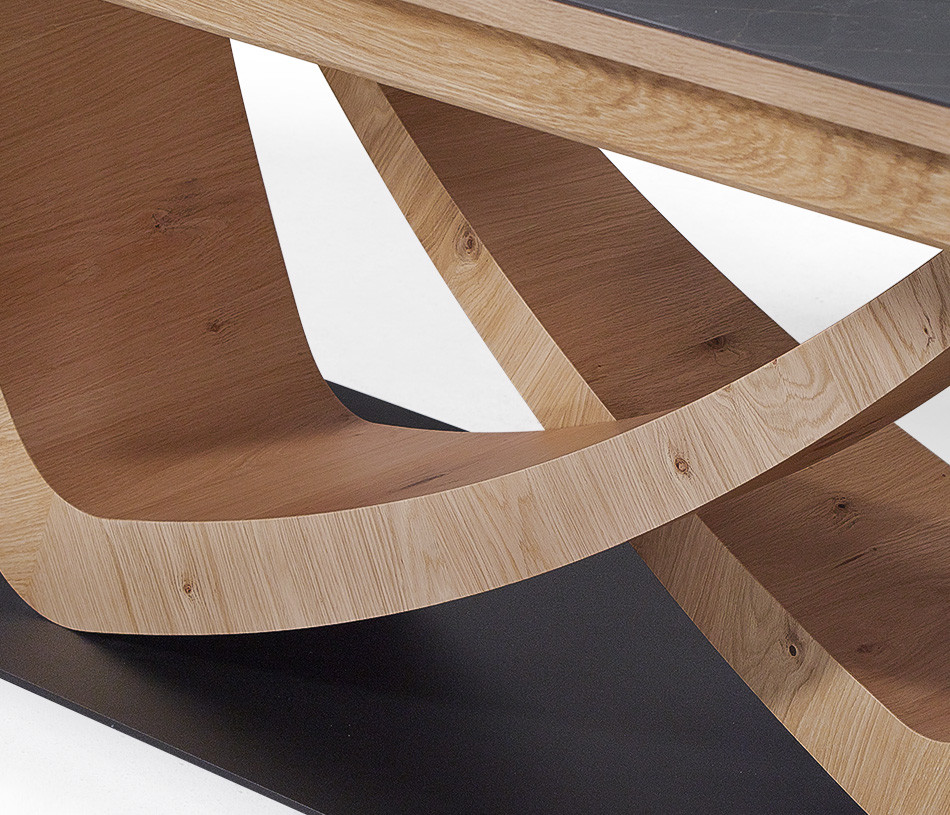 Le plateau associe la céramique à un motif en finition boisée, créant un contraste élégant et graphique. Ce jeu de matières apporte du relief à la table basse VOGE et lui permet de s’intégrer facilement dans différents styles d’intérieur.