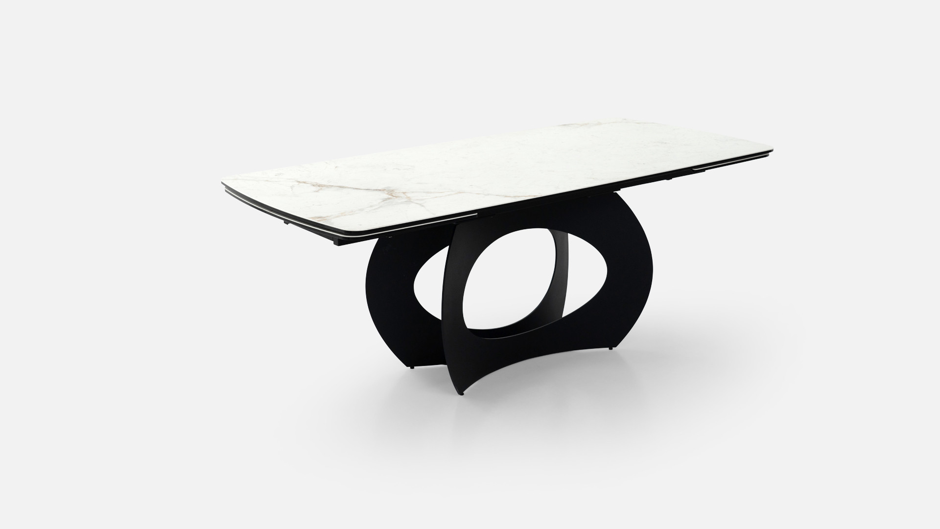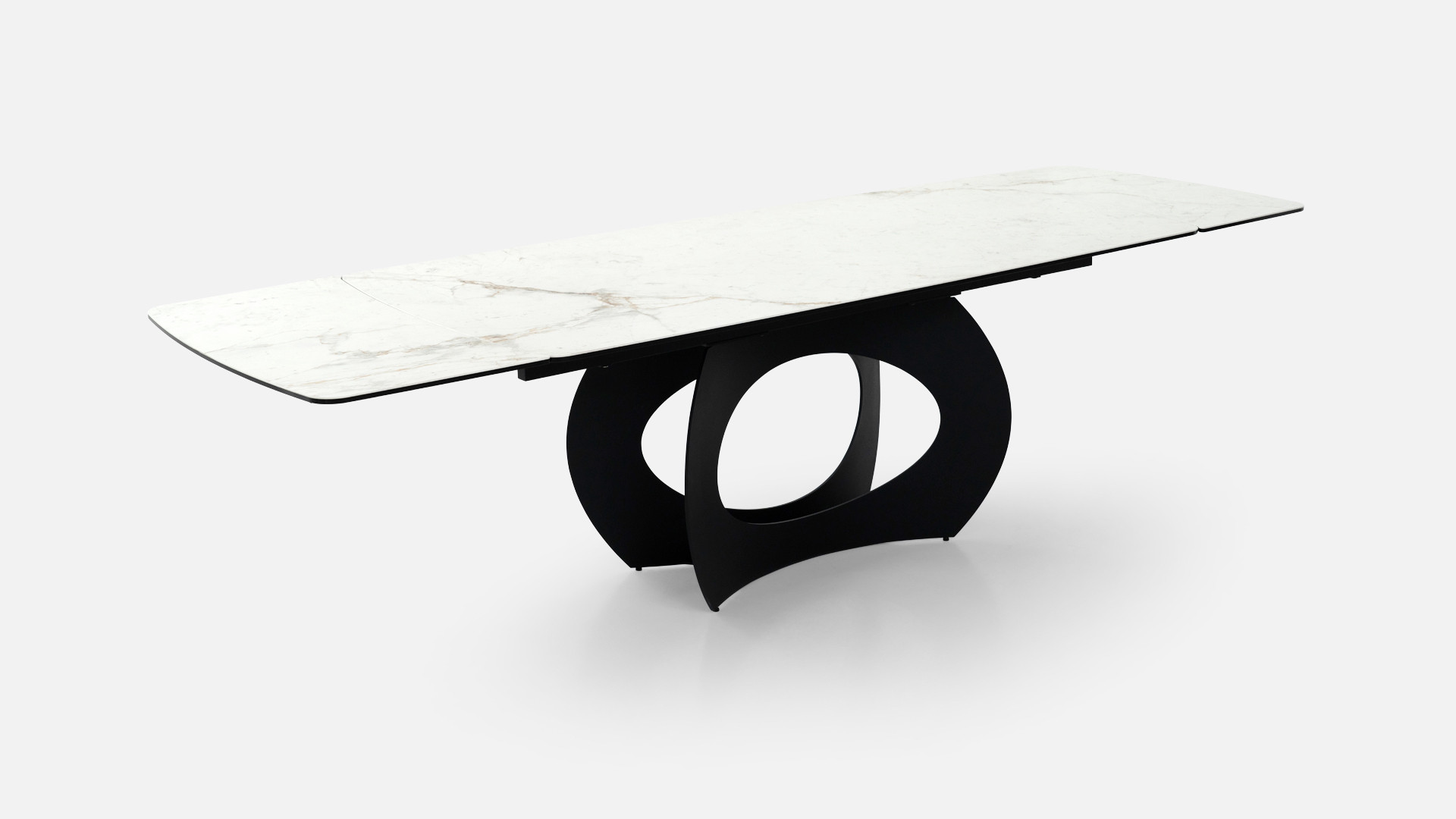 Plateau tonneau en céramique ép. 3.5 mm (variable selon la céramique choisie) collée sur verre teinté gris ép. 10 mm (variable selon la céramique choisie), ép. totale 13,5 mm. 2 Allonges en bout de table de 45 cm